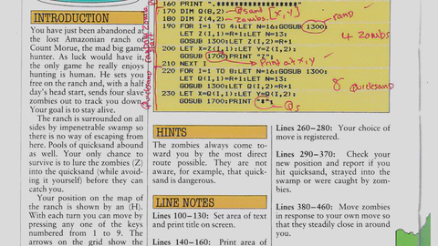 However, probably to fit the printing requirements of the book, the code is very compact. There are no variables with names longer than a single letter, zero comments and many lines have multiple instructions. I had to copy and write all over the code to figure it out.